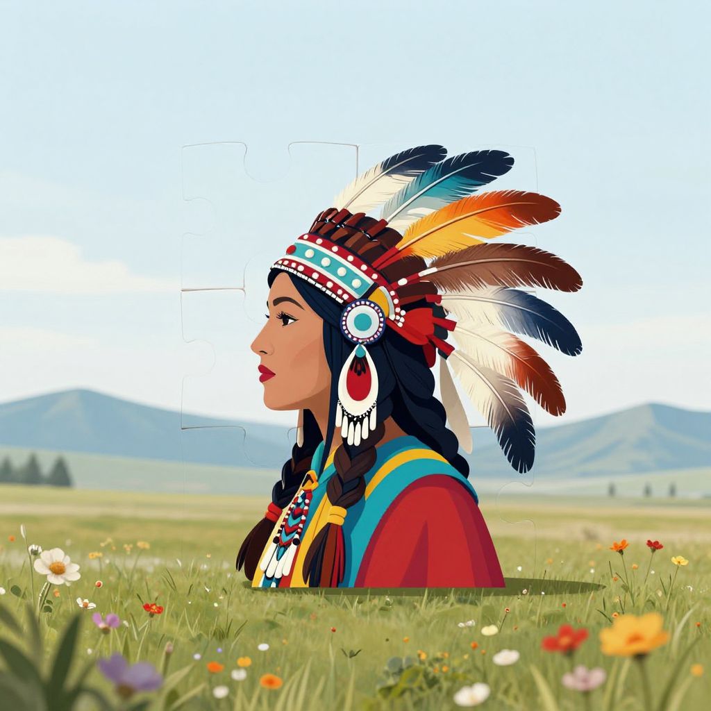 Native American-inspired jigsaw puzzle icon featuring a woman wearing a traditional headdress with vibrant feathers, intricate braids, and colorful attire, set against a serene prairie landscape with distant mountains and scattered wildflowers.
