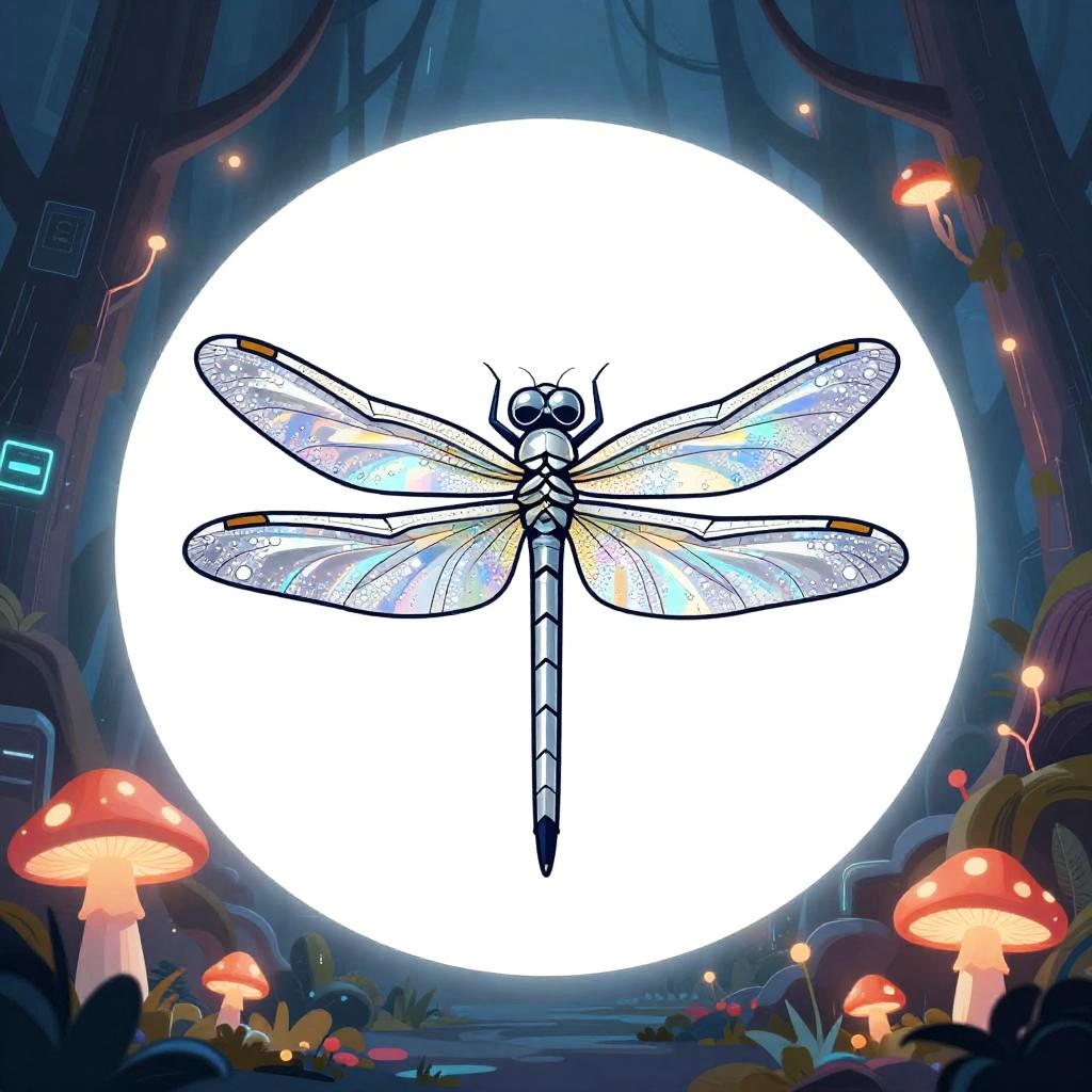 Futuristic holographic vector art profile avatar of a sleek silver dragonfly with iridescent wings set against a glowing cybernetic forest with neon mushrooms, bold outlines, crisp vector shapes, glossy highlights, playful expression, soft rim light, centered bust, circular crop, minimal background clutter, clean negative space, high contrast, smooth shading, subtle glow, sticker vibe, 1:1 aspect ratio, SDXL, social media icon, ultra sharp