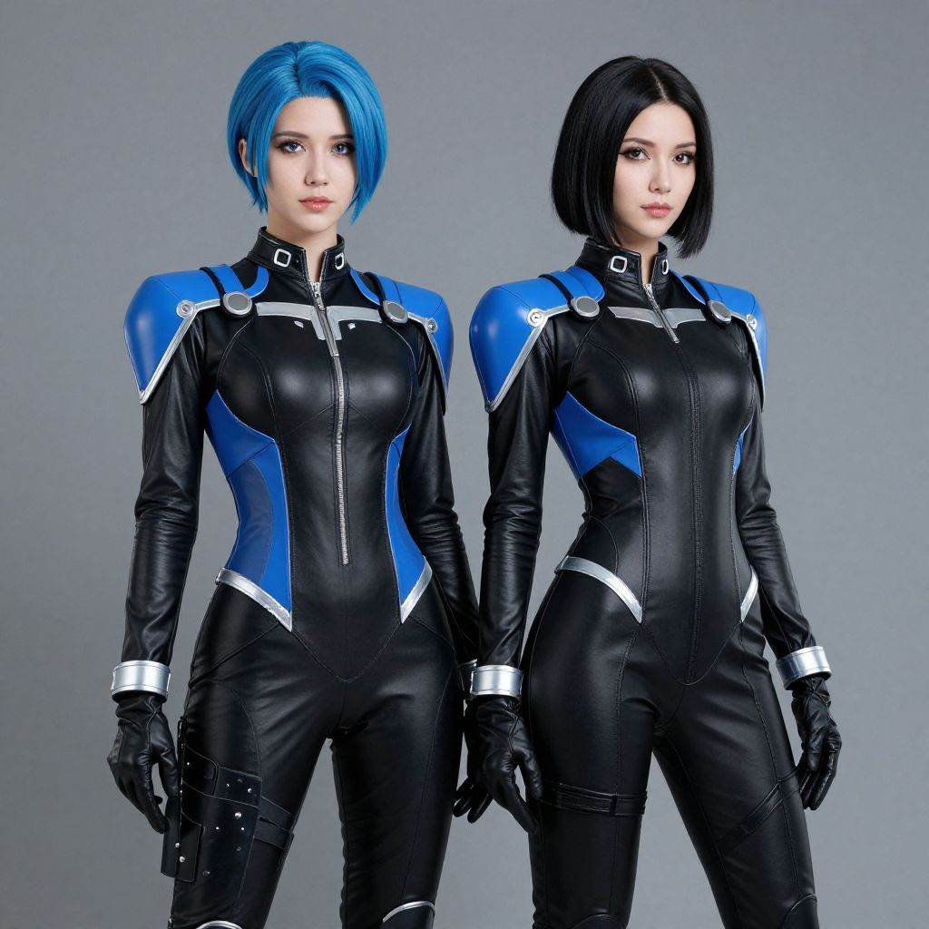 Photorealistic CGI image of two women standing side by side against a gray background. Both wear tight, black leather bodysuits with blue and white accents on the shoulders and chest. The woman on the left has bright blue, chin-length hair, while the woman on the right has short, black hair. They both wear black gloves and have a confident, serious expression. The bodysuits have a futuristic, armored design with zippers and silver buckles. The image emphasizes their athletic builds and the sleek, form-fitting nature of their outfits.