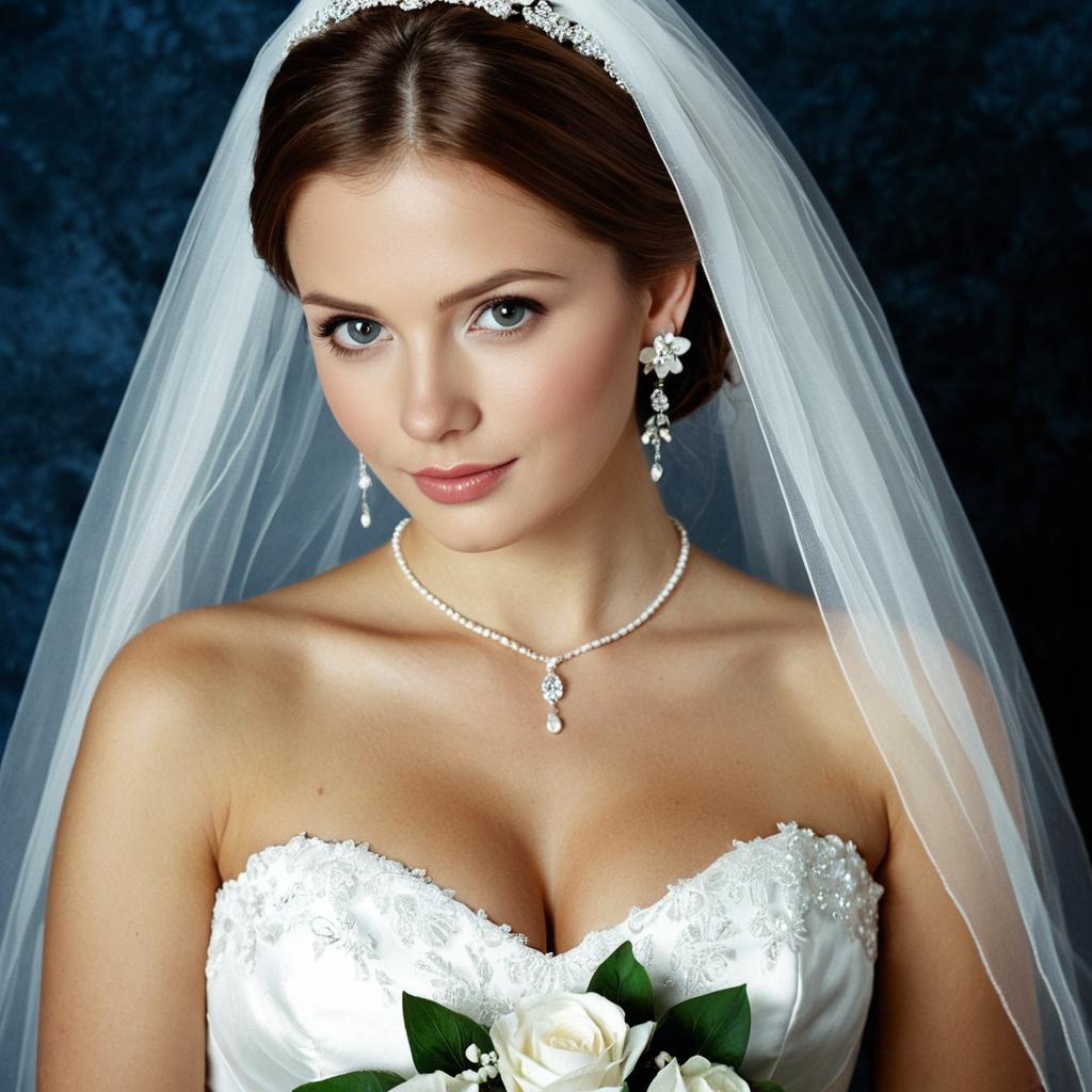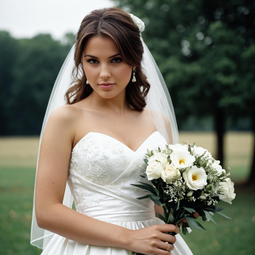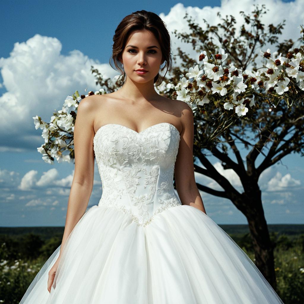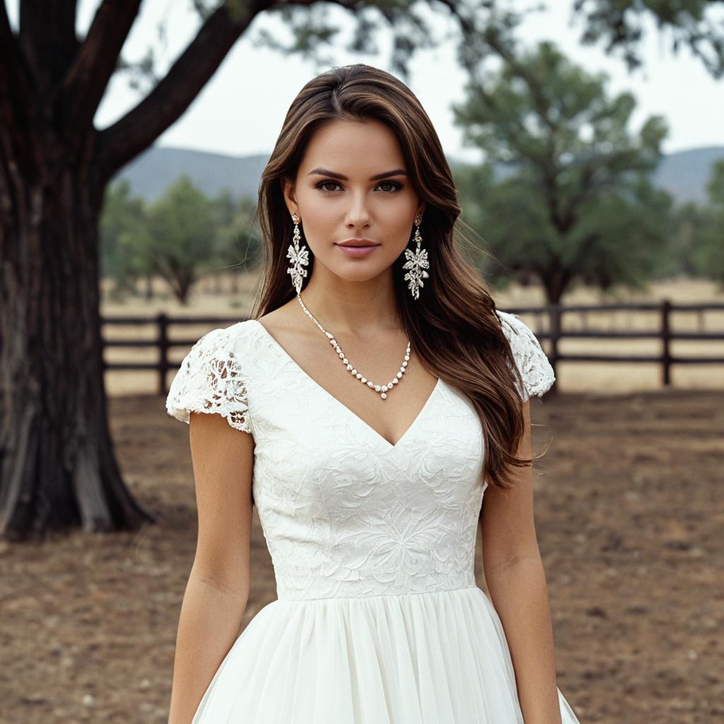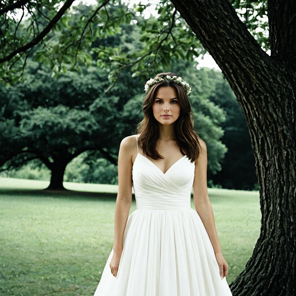 Petite wedding guest dress,1girl, solo, dress, outdoors, brown hair, looking at viewer, brown eyes, earrings, breasts, jewelry, short sleeves, tree, white dress, realistic, blurry, day