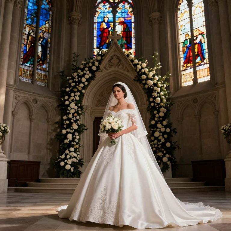Photograph of a bride standing in a Gothic-style church. She has fair skin and dark brown hair, styled in an elegant updo. She wears a white, off-shoulder, satin wedding gown with intricate lace details and a long, flowing veil. She holds a bouquet of white flowers. Behind her, tall stained glass windows display colorful religious scenes. The church's stone walls are adorned with white roses in tall vases. The floor is a polished marble, reflecting the light. The bride stands centered in the image, with the arched doorway and floral arrangements framing her. The overall scene is illuminated by natural light.