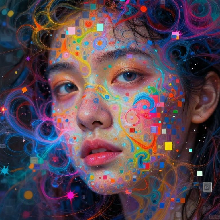 Digital portrait of a young child with vibrant, colorful swirls, pixels, and geometric shapes overlaying their face, creating a surreal, technicolor effect
