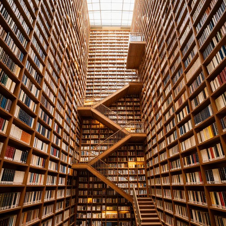 Photograph of a grand, modern library interior featuring tall, wooden bookshelves lined with an array of colorful books filling the space. The shelves are arranged in a symmetrical, ascending pattern, converging towards a central, angular staircase with a metal railing. Warm, natural light filters through a skylight at the top, casting a golden glow on the shelves and books. The image captures the intricate, geometric design of the library, emphasizing the verticality and density of the book collection. The overall atmosphere is one of academic grandeur and intellectual pursuit.