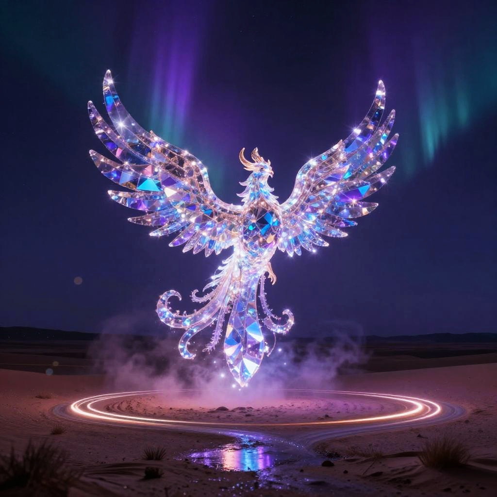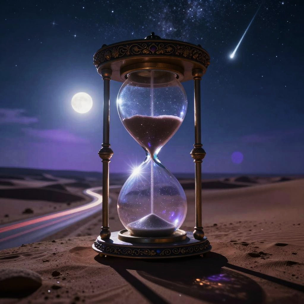 Floating ornate celestial hourglass suspended above desert nightscape under vivid Milky Way and distant meteor showers, silvery moonlight mixing with soft violet and midnight blue shadows, star reflections; reflective surfaces and prismatic highlights, volumetric fog or light rays, long exposure light trails across wet streets, symmetrical yet dynamic composition, soft bloom with dreamy sharpness, bokeh accents and subtle lens flare, moody atmosphere, hyper-detailed textures, elegant negative space, immersive scale, surreal serenity, gentle haze, shimmering reflections, cohesive color grading, cinematic polish