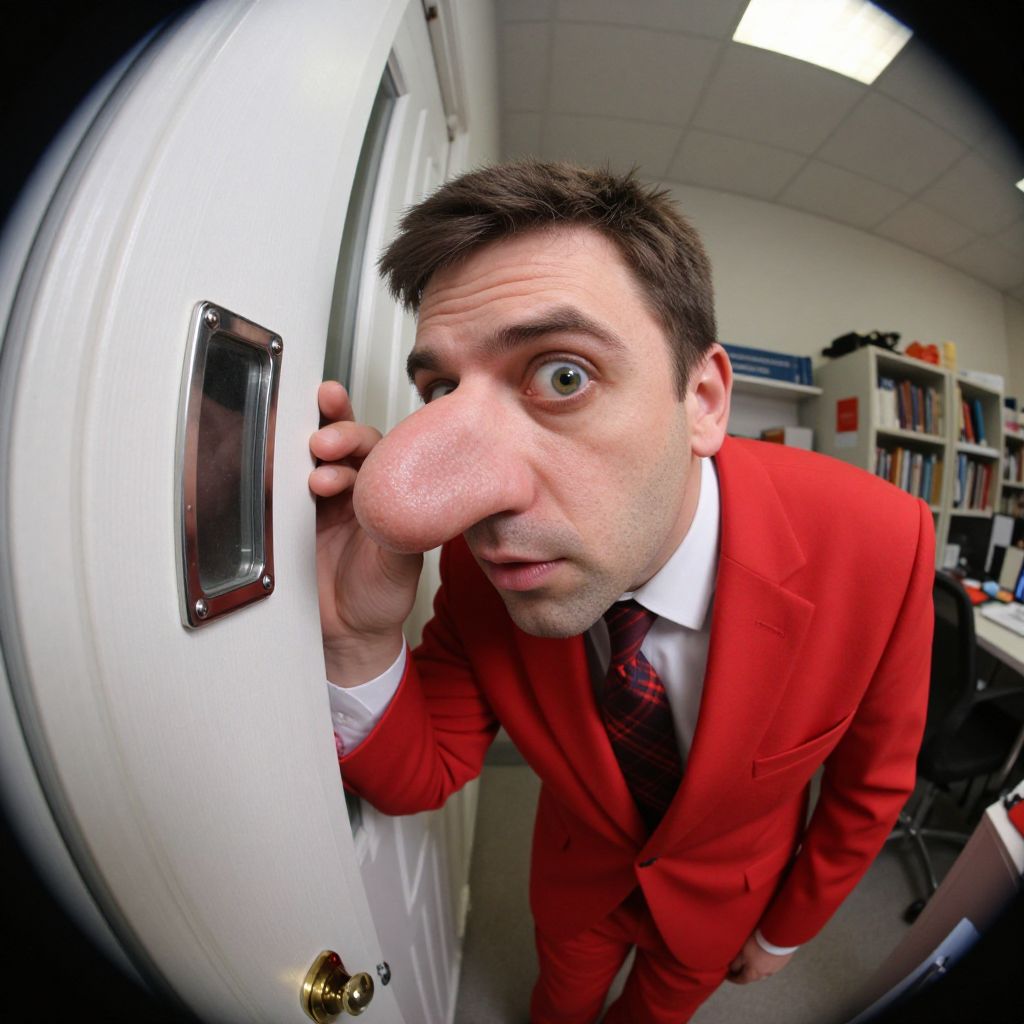 Photograph of a Caucasian man with short, dark brown hair and fair skin, peering through a white door with a surprised expression. He wears a bright red suit, white shirt, and red tie with a pattern. His large nose is exaggerated, resembling a cartoon style. The setting is an office with white walls, fluorescent ceiling lights, and bookshelves in the background. The image has a fisheye lens effect, creating a curved, distorted view. The door handle is gold-colored, and the door frame has a rectangular metal insert.