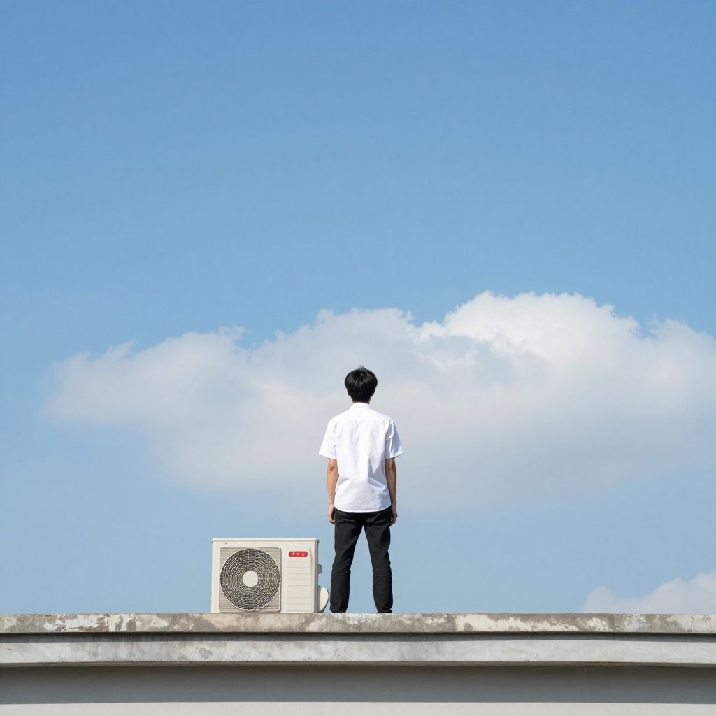 Photograph of a man standing on a rooftop, facing away from the camera, under a clear blue sky with a small airplane flying in the distance. The man has short black hair and wears a white t-shirt and black pants. An air conditioning unit with a circular fan sits to the left, and the rooftop edge is slightly worn. The sky is bright and mostly clear with a few scattered clouds. The image has a minimalist, slightly surreal quality, emphasizing the contrast between the man and the vast sky.