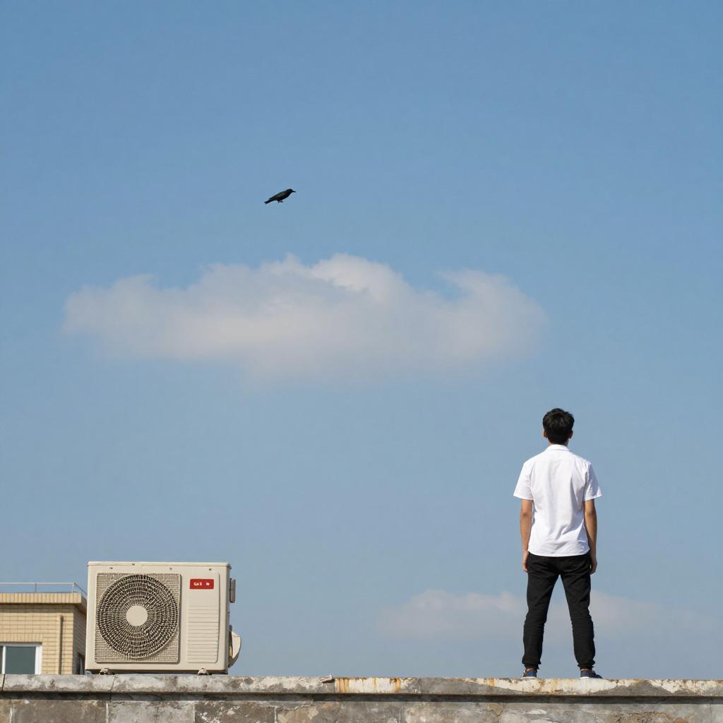 Air conditioner, 1boy, sky, bird, blue sky, male focus, outdoors, white shirt, shirt, black hair, cloud, solo, pants, rooftop, standing, black pants, day, wide shot, short sleeves, from behind, short hair, building, crow, animal
