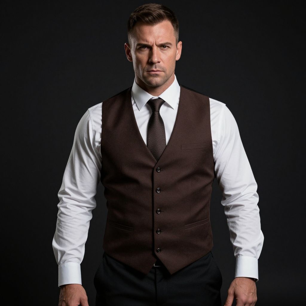 Man with short brown hair, a white shirt, a brown vest, a tie, and black pants. The man has a serious expression on his face and is standing in front of a dark background. He has a muscular build and a confident posture, exuding authority and professionalism. The lighting is dim, highlighting his sharp features and the contrast between his sharp attire and the dark environment. The scene is formal and imposing, emphasizing his presence and stature.