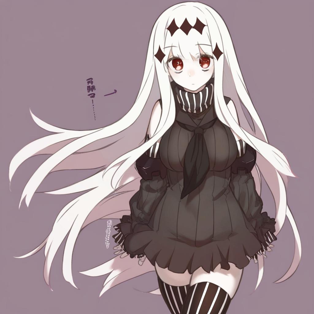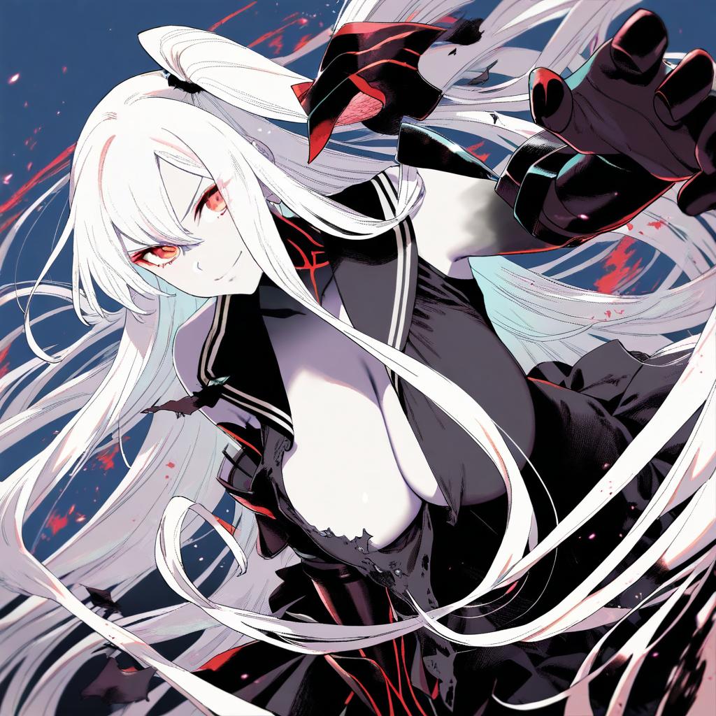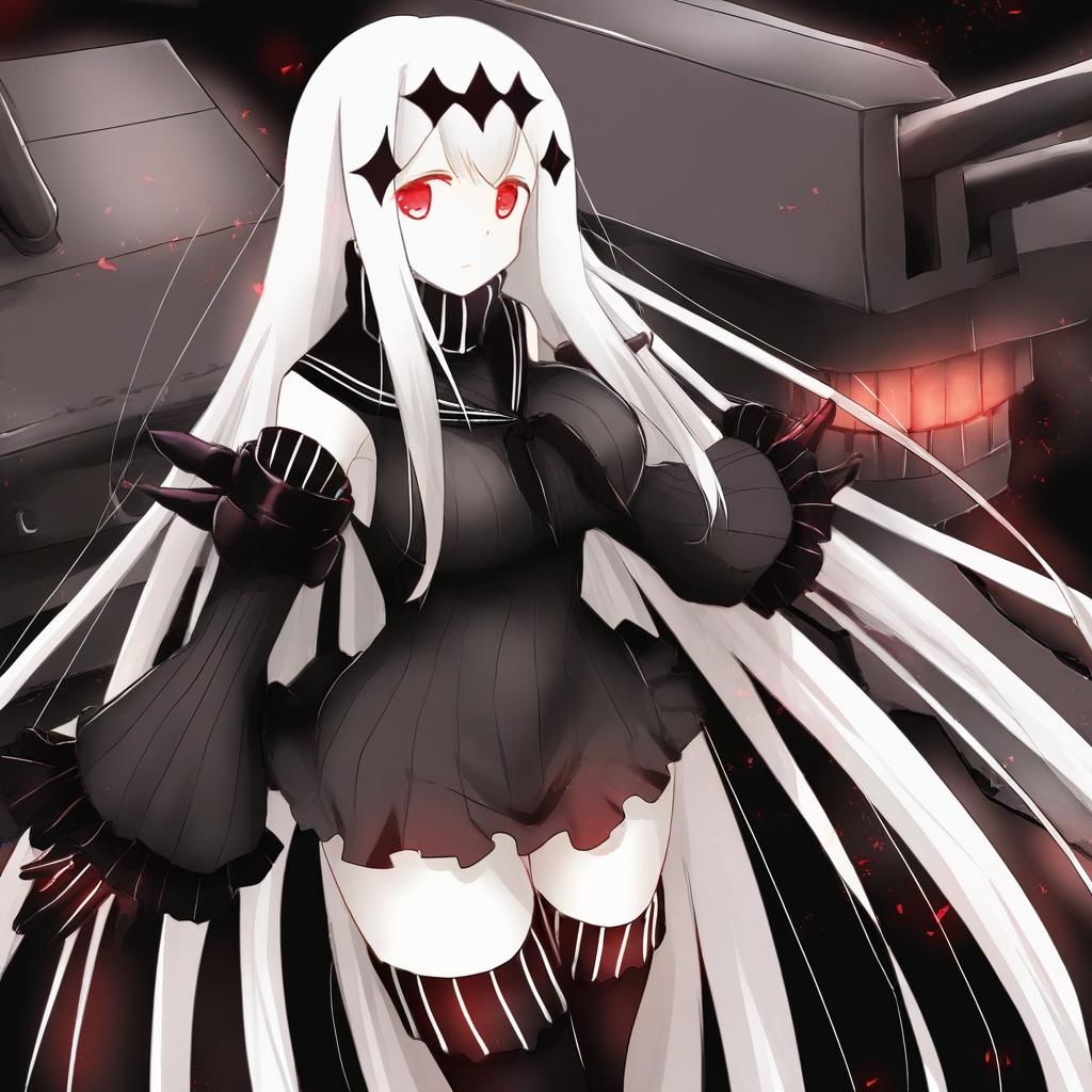 Aircraft carrier water oni, kantai collection, 1girl, white skin, red eyes, white hair, very long hair, long hair, hair ornament, large breasts, armor, short dress, ribbed dress, sailor dress, black dress, detached sleeves, zettai ryouiki, by artist nokuhashi, animagine