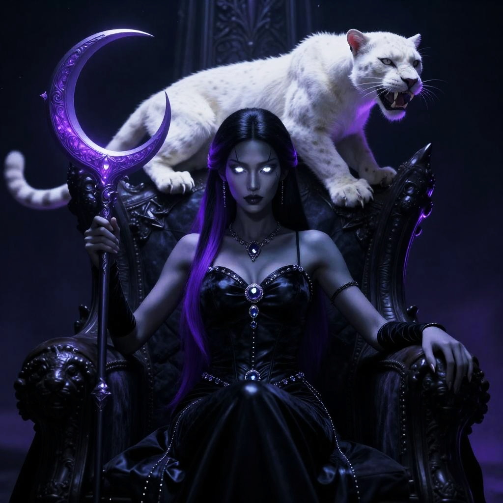 A breathtaking portrait of Leire, Princess of the Ancient Forest, captured in a stunningly detailed 8k cinematic shot, seated majestically in an lush mossy grotto. Her piercing amber eyes and elegantly angular face complement her rich earth-toned skin, framed by cascading chestnut hair highlighted with green vines. Clad in an exquisite forest green gown adorned with blooming flowers, she grips an intricately designed vine scepter with delicate leaf patterns. A fierce silver Fox cub rests atop her throne, baring its teeth as dappled light illuminates the scene, creating a powerful and captivating atmosphere.