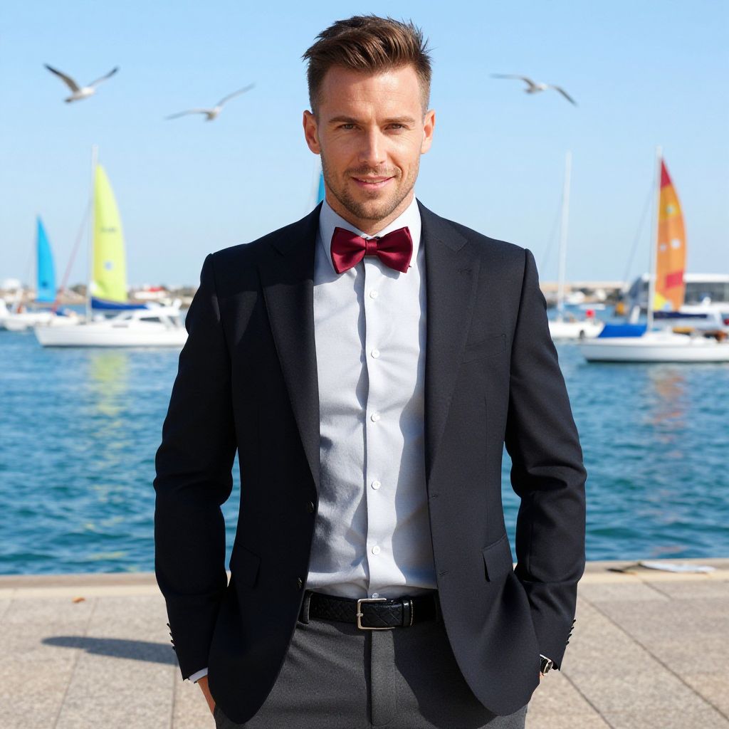 A man, slim-fit black suit, light gray dress shirt, deep red bow tie, matte black loafers, textured black belt, sun-drenched docks, colorful sailboats bobbing, seagulls soaring overhead, casual smile, vibrant and lively atmosphere. Man has masculine face and piercing eyes