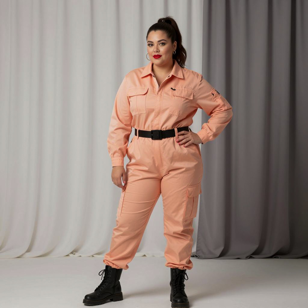 Woman push pop star plus, photorealistic portrait of a plus-size woman, standing, full body, wearing peach-colored utility jumpsuit with black belt, black combat boots, dark hair in high ponytail, red lipstick, neutral background with white and gray curtains, studio lighting, casual pose, confident expression, slightly blurred edges, realistic ures, slight vignette effect