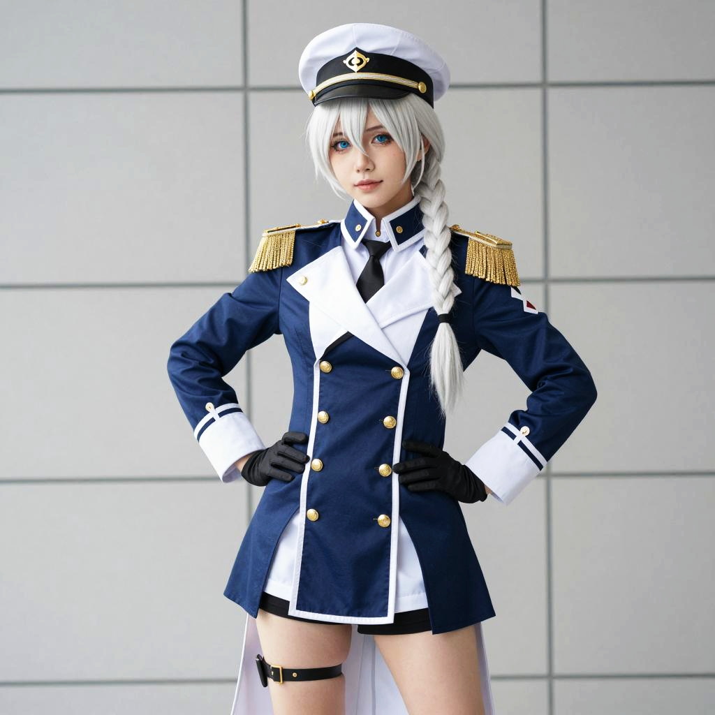 A woman dressed in an elaborate Altair Re:Creators cosplay outfit stands confidently against a tiled wall background. The costume features a detailed navy blue and white military-style uniform with gold buttons, epaulets, and a distinctive white and black cap, complemented by her braided white hair and black gloves, capturing the intricate design and style of the character.