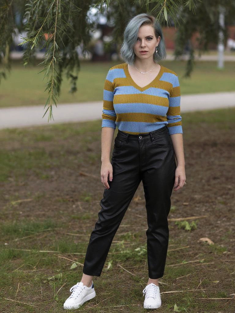 A Willowy woman, in a Chuck Close visual style, wearing a striped knit top in blue and mustard yellow tucked into black faux leather pants, paired with white lace-up sneakers, short pastel blue hair with side-parting, standing in a scenic park with open meadows. Sexy. Pretty face and beаutiful eyes. Big breasts