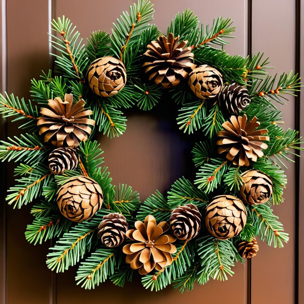 Close-up of a holiday wreath decorated with green pine branches and various sizes of brown pine cones. The wreath is hanging on a wooden door, showcasing a soft holiday ambiance. The image emphasizes natural textures and festive decor in a portrait format.
