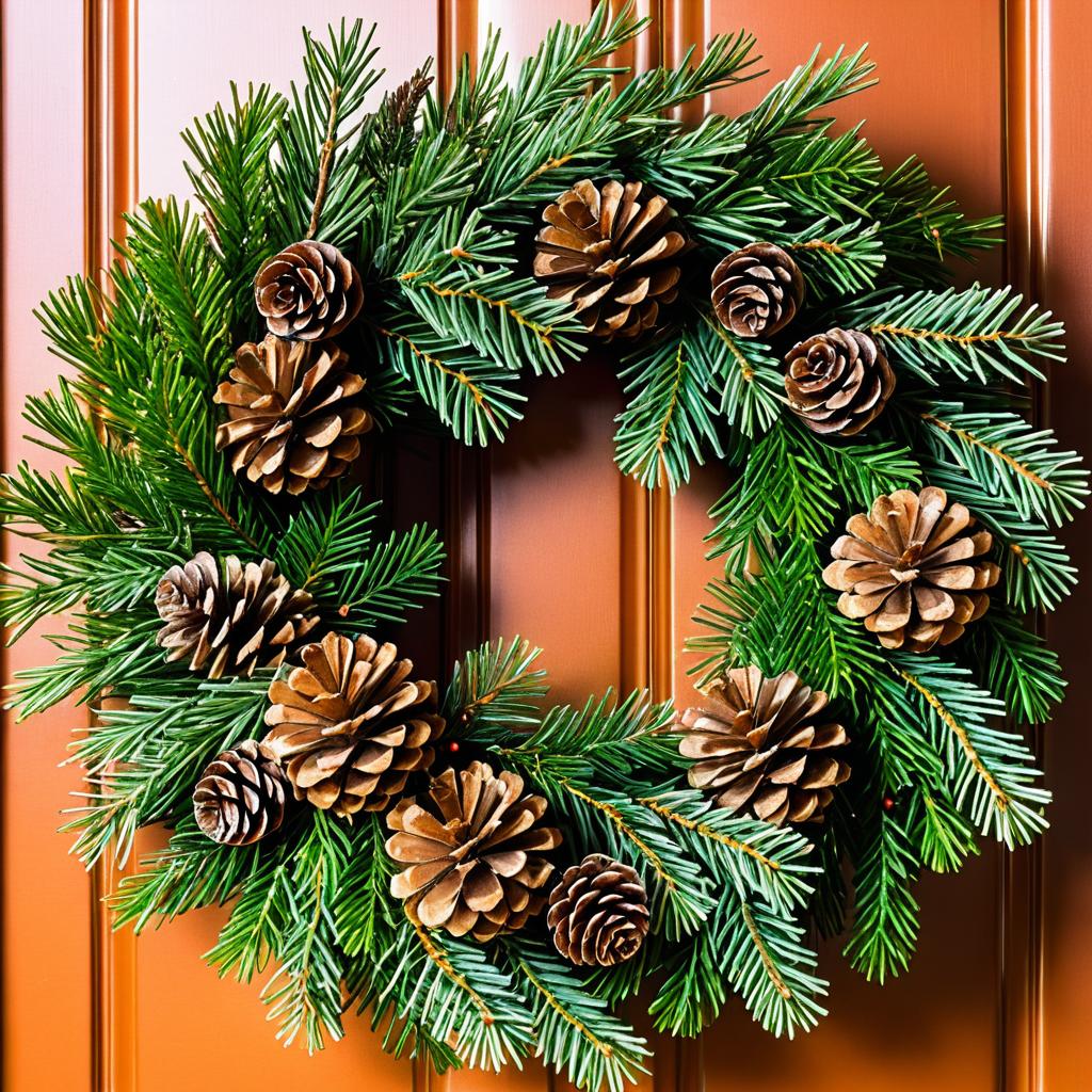 Close-up of a festive wreath adorned with pine cones, portrait mode, soft holiday ambiance.