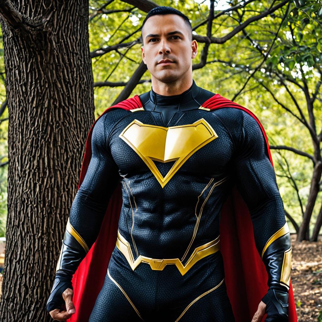Aquaman costume man,1boy, male focus, solo, facial hair, long hair, beard, bodysuit, brown hair, tree, standing, looking at viewer, mustache