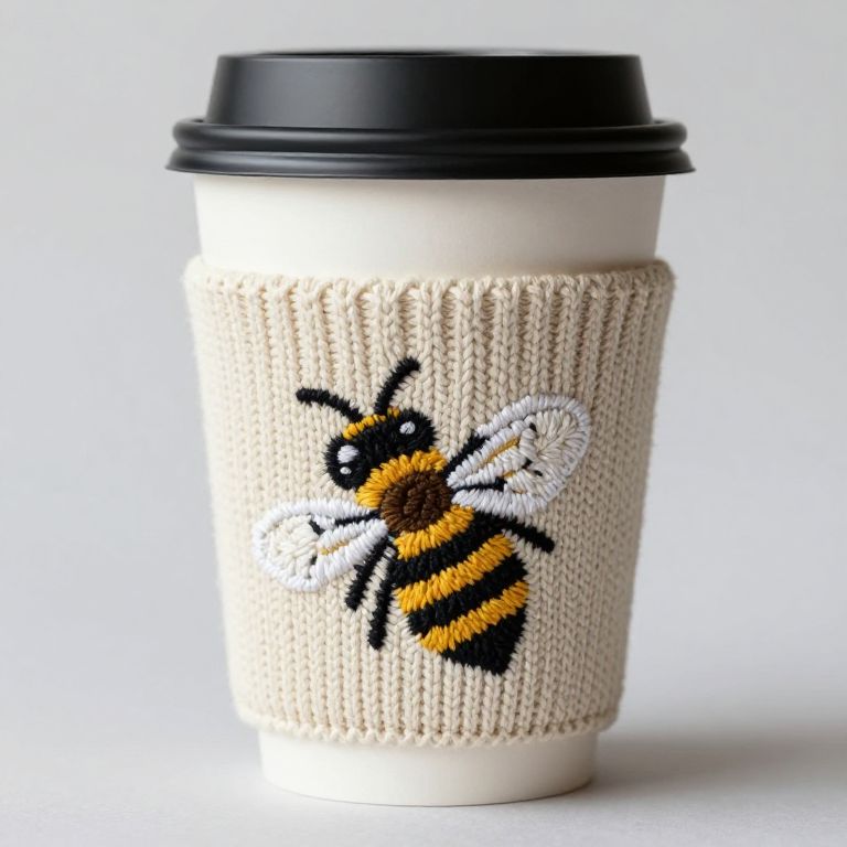Photograph of a white disposable coffee cup with a black lid, wrapped in a beige knitted sleeve featuring a colorful embroidered bee with black, yellow,