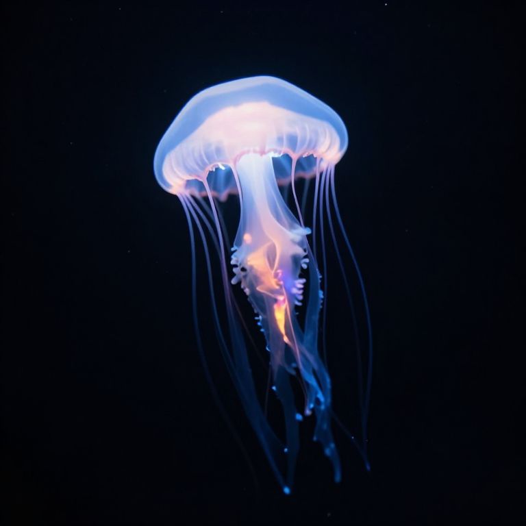 A luminous jellyfish of ethereal beauty floats serenely above a dark, viscous sea, its radiant glow illuminating the void and casting prismatic reflections that dance like whispers of hope across the starless expanse, evoking a profound sense of wonder and existential solitude.