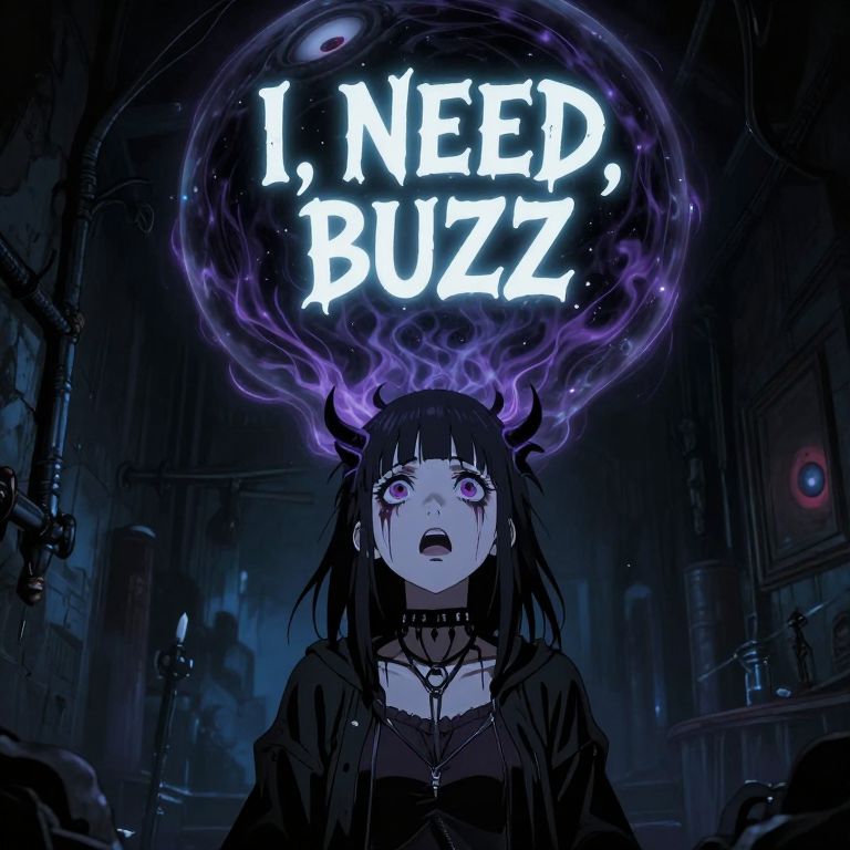 High quality anime art style, occult ritual, horror vibe, demonic possession, scared punk girl in the dark basement looking up, dark paranormal power with eyes coming from her head and forming a dark bubble with text: \"I, NEED, BUZZ