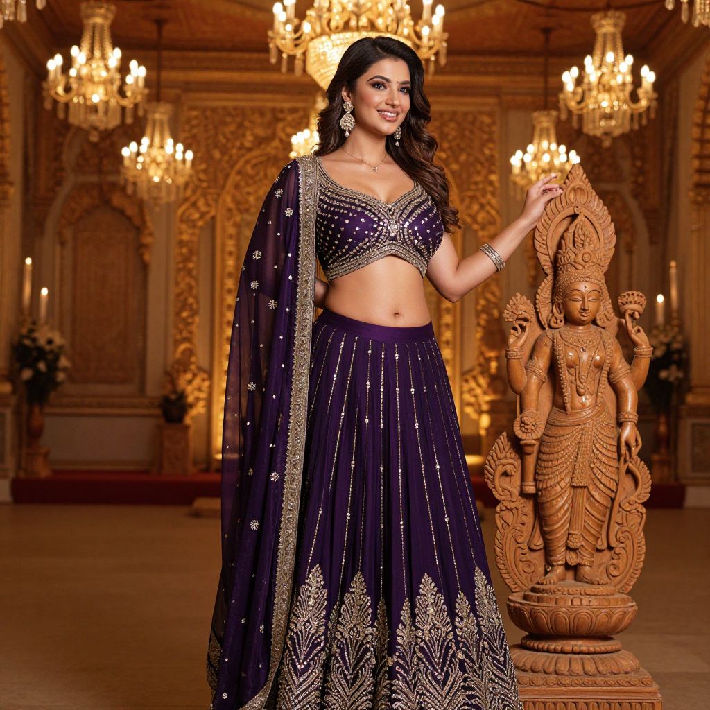 A glamorous Diwali woman costume in deep purple with sparkling zari work and a flowing shawl, captured in a grand Diwali ceremony hall with ornate chandeliers and a woman with smooth olive skin, high cheekbones, and a radiant smile, standing beside a carved wooden deity.. The woman has big tits and cute face