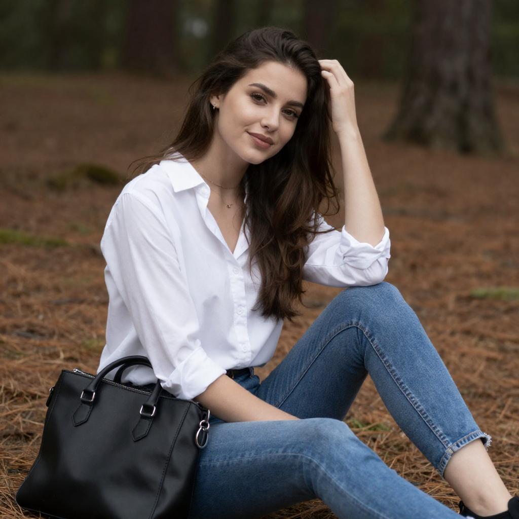 Photograph of a young woman with long brown hair, wearing a white blouse and blue jeans, sitting on the forest floor. She has a slim build, fair skin, and is smiling slightly while touching her hair. A black leather bag lies beside her on the pine-needle-covered ground. Dark trees form the background.