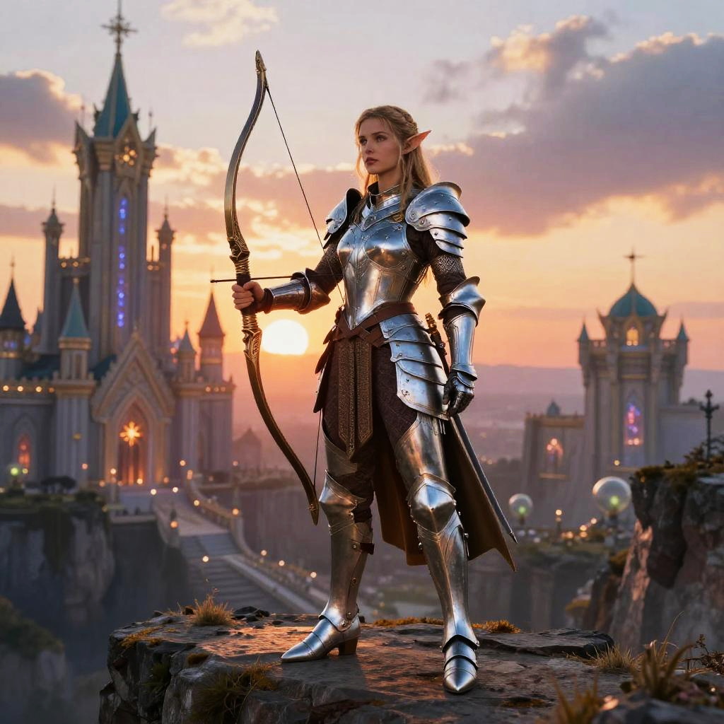 Female elf noble warrior in shining armor, holding an ornate bow, poised on a cliff overlooking an enchanted kingdom, vibrant sunset colors, fantasy epic setting