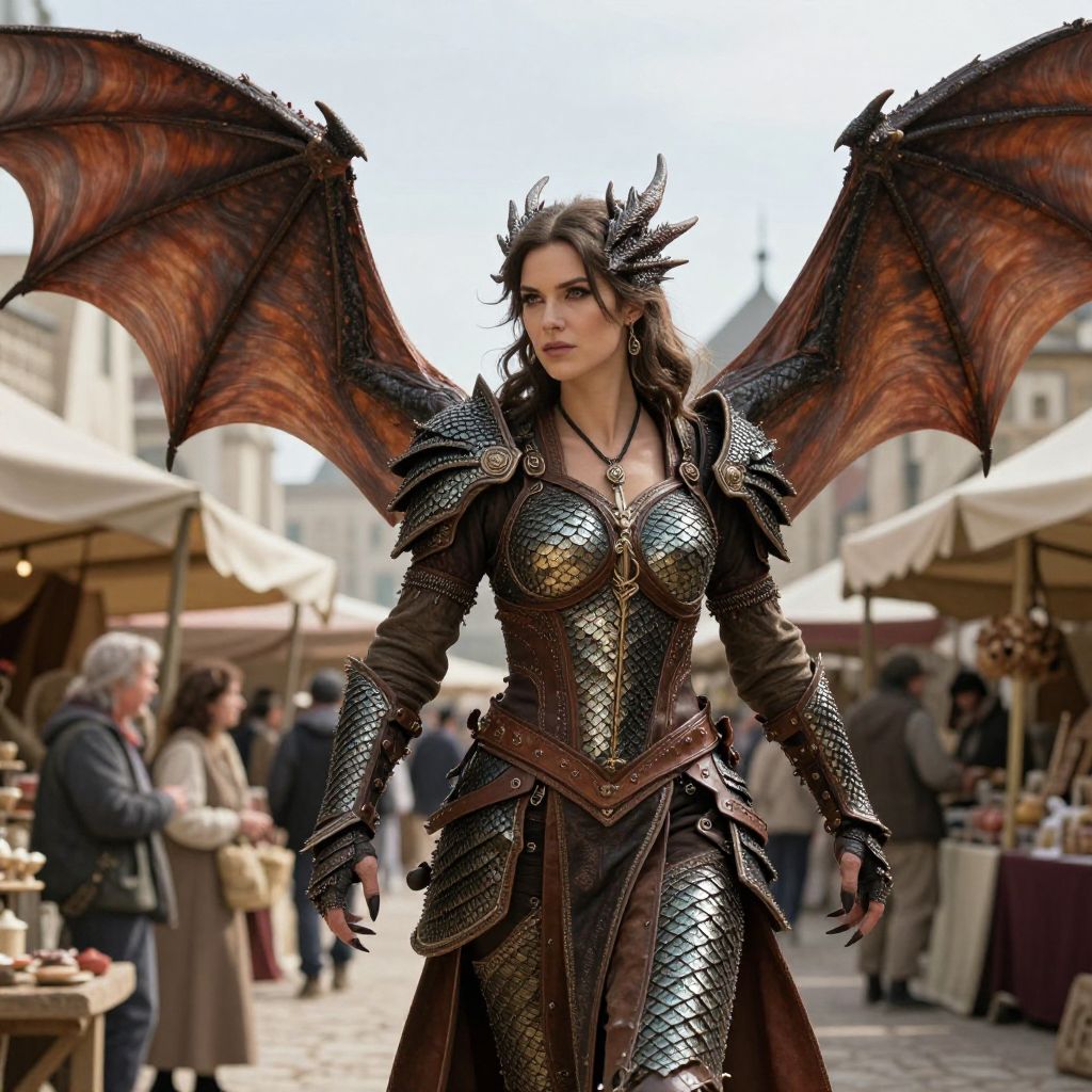 Half dragon female in a fantasy city marketplace, blending human and dragon features seamlessly, elegant yet fierce, wearing intricate leather armor with dragon scale patterns, her wings partially spread, interacting with curious townsfolk under a bright sky.