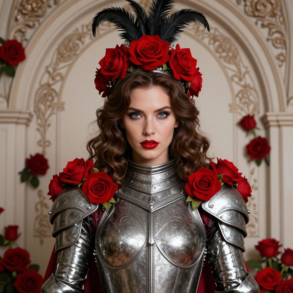 A digital art image of a fair-skinned woman with wavy brown hair, wearing ornate silver armor adorned with red roses. She has a regal crown with black feathers and red roses. The background features an arched, decorative wall with floral patterns and more red roses. Her intense blue eyes and bold red lipstick stand out, giving her a fierce yet elegant look.