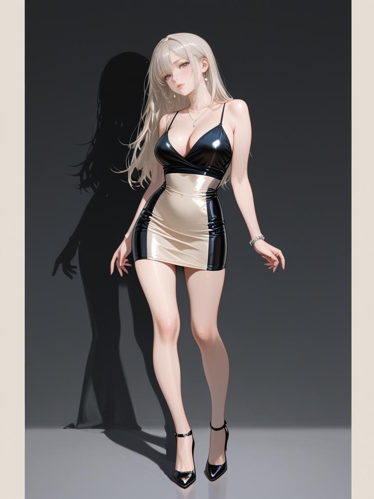 1girl, realistic face, full body shot, Woman, modern party fashion, metallic magenta crop top with square neckline, sleeveless, matching high-waisted mini skirt, shiny satin-like material, straight-cut hem, holding a purple clutch, white background.