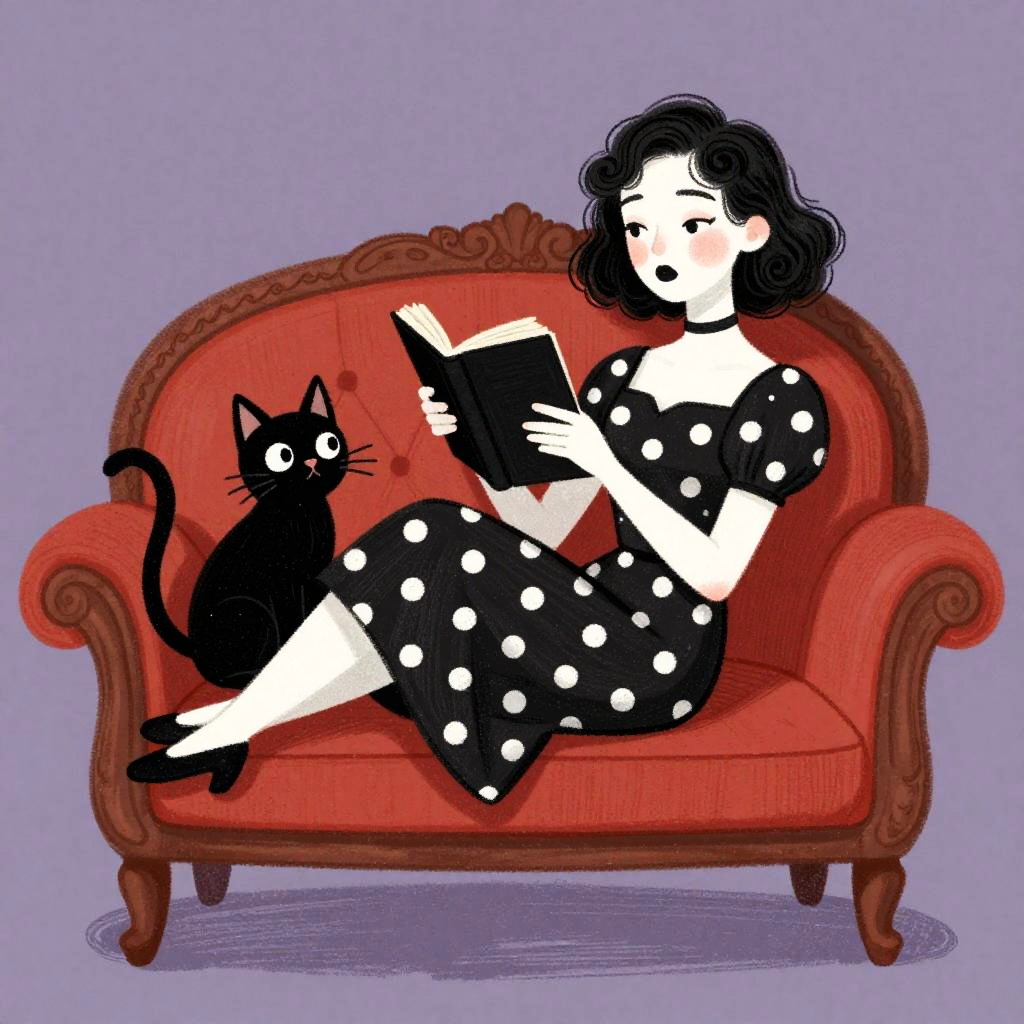 This is a digital drawing in a vintage, whimsical style. It features a pale-skinned woman with curly black hair, blushing cheeks, and black lipstick, wearing a black dress with white polka dots. She's lounging on a red, ornate couch, holding a black book, while a black cat with a curled tail sits beside her. The background is a muted purple.