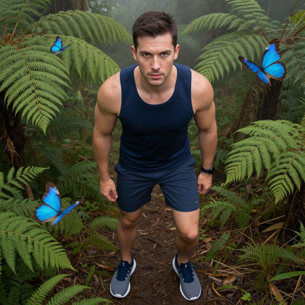 A man, fitted moisture-wicking tank top, lightweight stretch shorts, breathable mesh sneakers, navy blue and charcoal gray, misty undergrowth, towering ferns, vibrant blue butterflies fluttering, overhead shot, focused expression, ready for adventure. Man has masculine face and piercing eyes