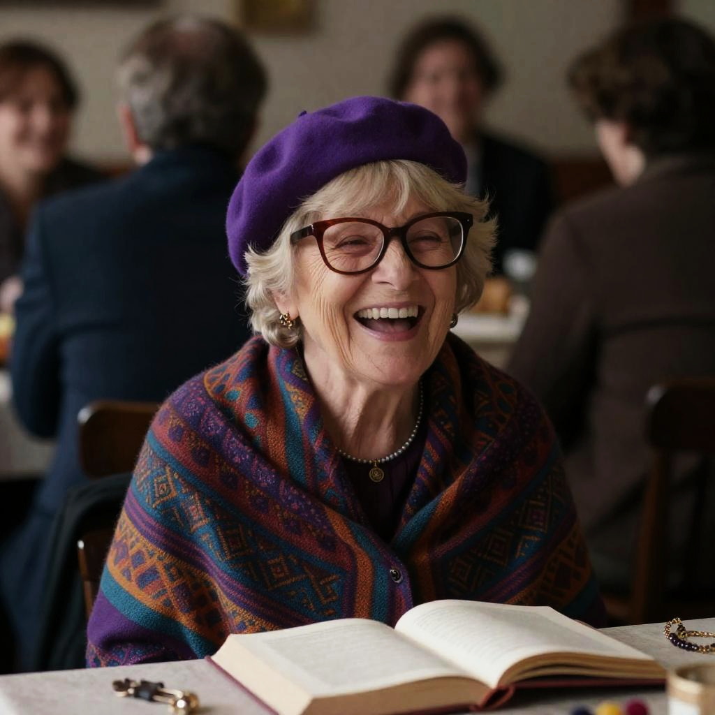 Old woman with short blonde hair, purple beret, large glasses, colorful patterned shawl, laughing joyfully, seated at table. Background: blurred people, some smiling, dimly lit. Table with open book, jewelry. Warm, intimate atmosphere.