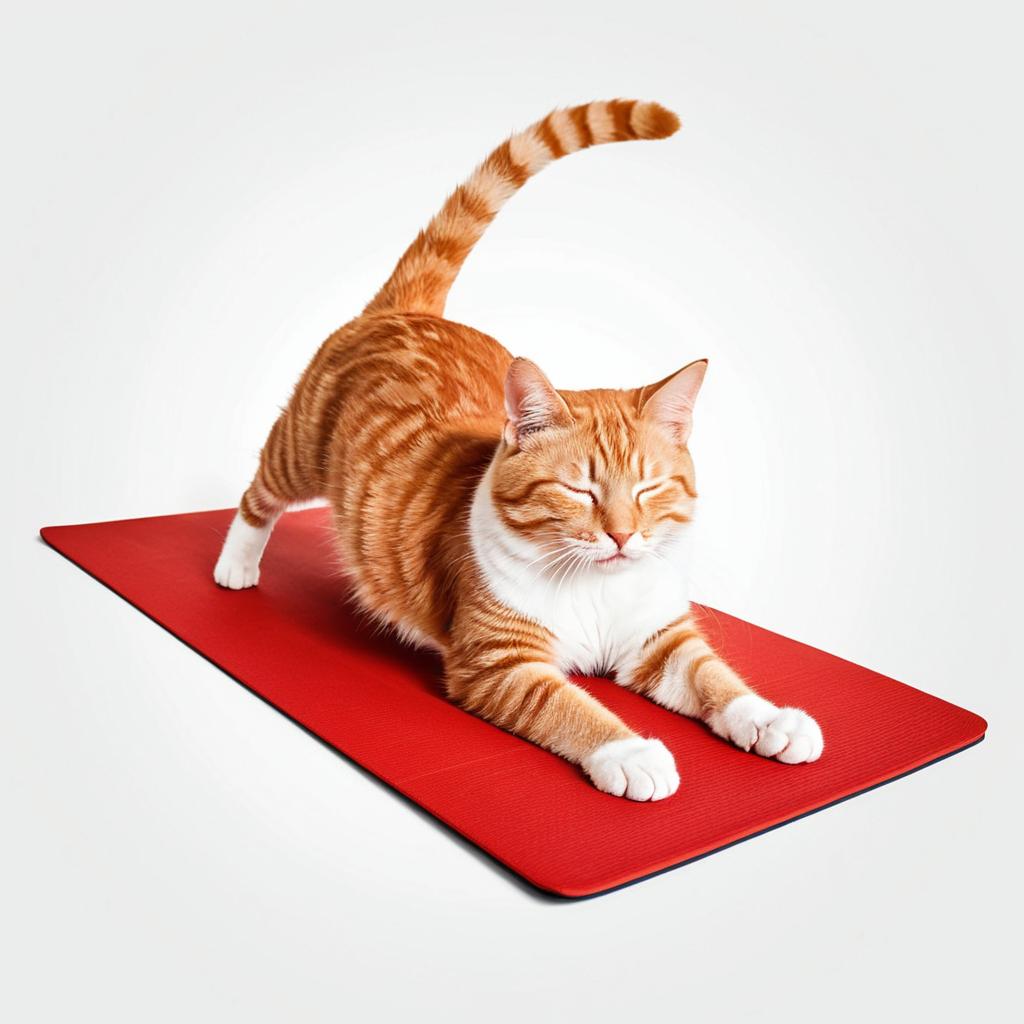 Illustration of a sleek black cat stretching with its back arched on a purple yoga mat. The image features clean edges, strong black contour lines, and a pure white background, rendered in a watercolor style with medium detail and flat colors.