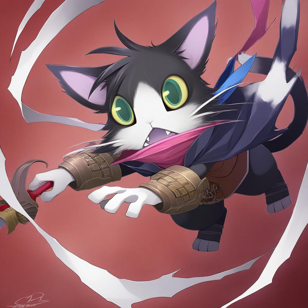 Digital illustration of Cait Sith, a black and white cat character from Final Fantasy VII, depicted in a dynamic and action-packed pose. The cat has large green eyes, wears a blue and pink scarf, armor-like wrist guards, and wields a sword. The background is a soft red gradient.