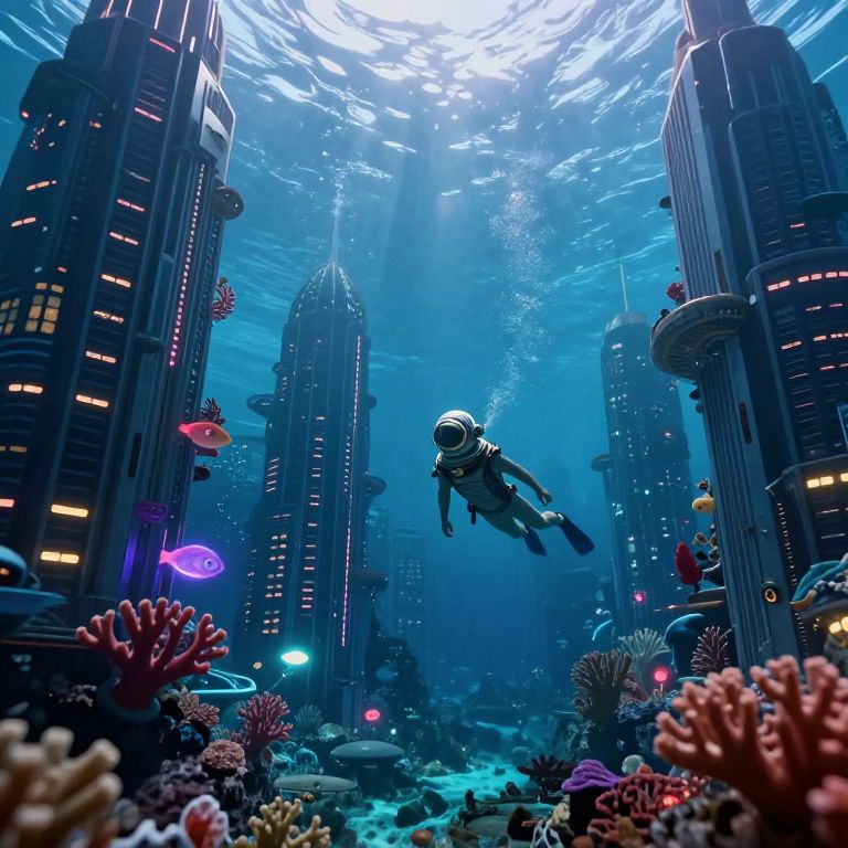 A dreamlike cityscape emerges from an underwater perspective, where skyscrapers resembling towering coral reefs rise vertically into a sky that melds seamlessly with ocean waves. Neon-lit windows in these structures glow like fish eyes, casting an ethereal light throughout the scene. A lone figure, clad in a vintage diving helmet with intricate pinstripes, gracefully swims through this surreal world, evoking curiosity and wonder as they explore its mysteries. The refracted light from the water illuminates the city's metallic structures, creating an atmosphere of enchantment that draws viewers into this captivating otherworldly vision.