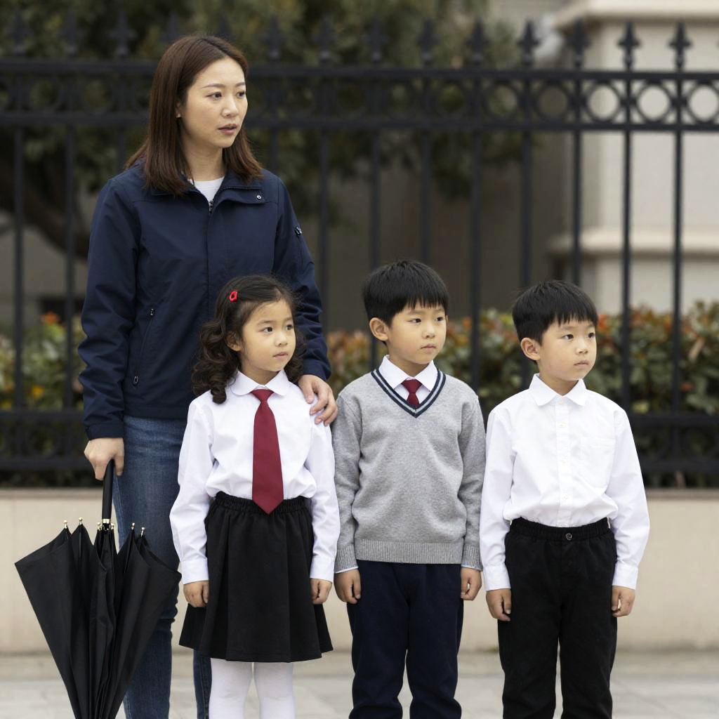 Photograph of three young boys in formal black suits with white bow ties and white dress shirts. The boy on the left looks to the side with a neutral expression. The middle boy gazes downward, while the right boy looks at the middle boy with a slight smile. Background shows a blurred indoor setting with a lamp. The boys stand close together, with the right boy's hand on the middle boy's shoulder.