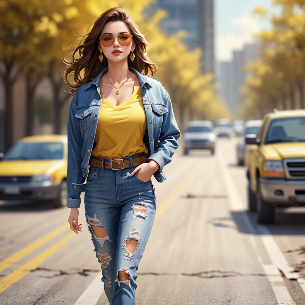 A full-body image of a young woman walking confidently on a city street. She is wearing a yellow shirt paired with a light blue denim jacket and ripped blue jeans held with a brown belt. Her long brown hair is flowing and she accessorizes with orange-tinted sunglasses, gold earrings, and a necklace. The background shows a blurred urban setting with cars and autumn-colored trees lining the road.