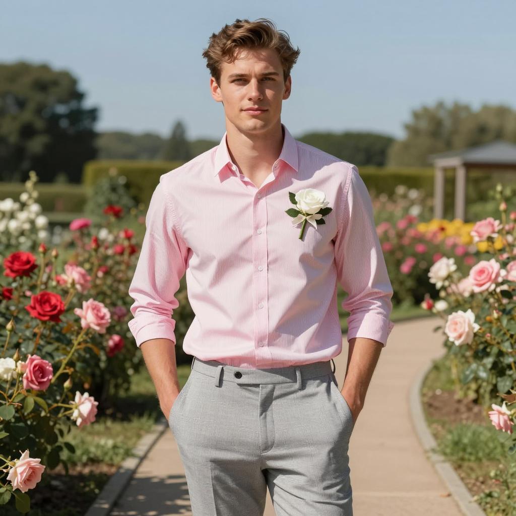 Man designer silk shirts, photorealistic portrait of a handsome young man with short brown hair and a slight beard, wearing a floral shirt with red and blue flowers, standing in a vibrant garden, bright sunlight, background full of colorful flowers in pink, purple, orange, and yellow, casual pose, hands in pockets, mid-shot, soft focus background, modern fashion, confident expression, natural light, summer vibe