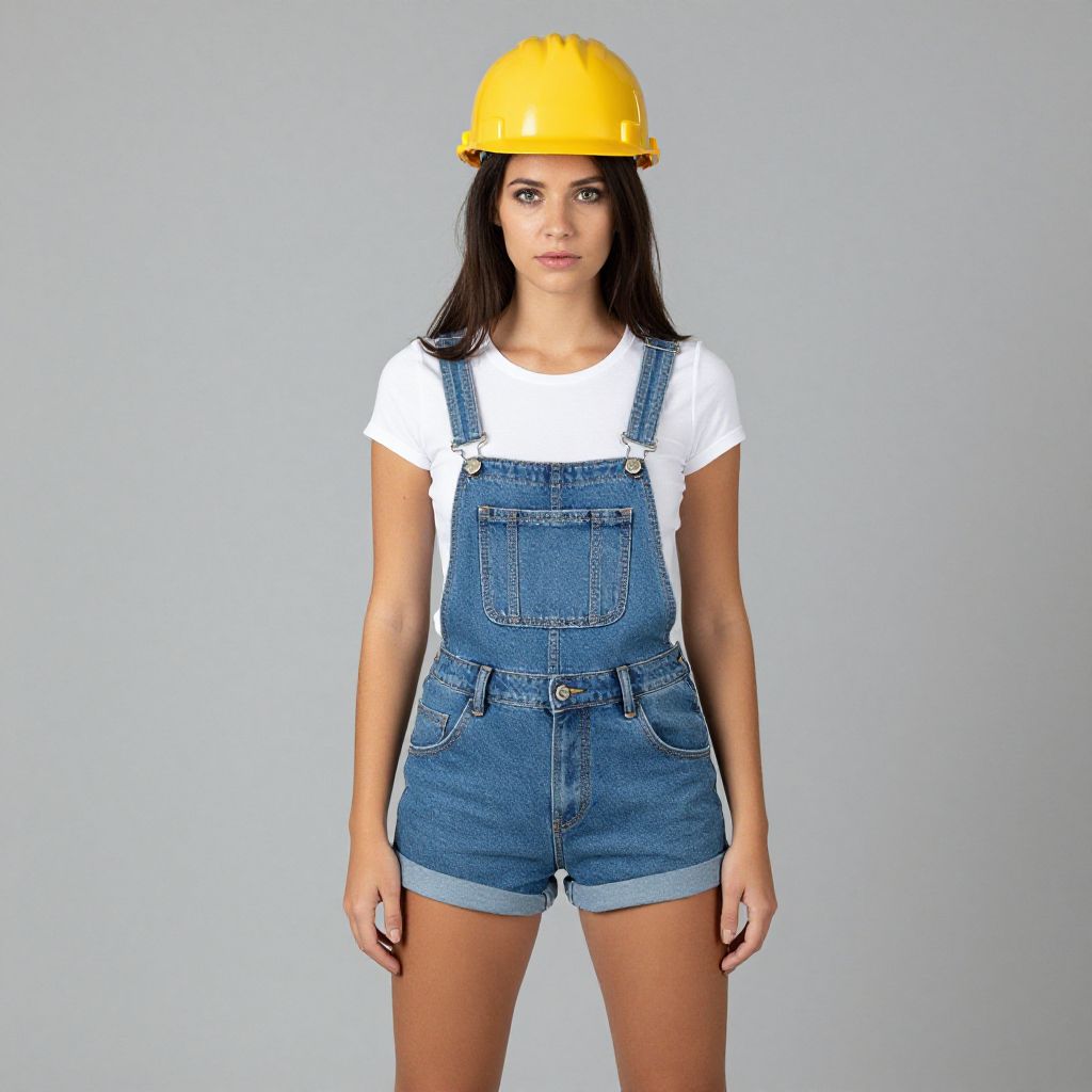 Photograph of a young woman with medium brown skin and long, straight black hair, wearing a black wide-brimmed hat, sleeveless denim overalls with white snap buttons, and a small gold necklace. Her overalls are rolled up at the cuffs, revealing her slender arms and legs. She stands against a plain, light gray background, facing the camera with a neutral expression. The denim has a slightly faded, textured appearance, and the overall style is casual and modern. The lighting is even, highlighting her features and outfit without shadows.