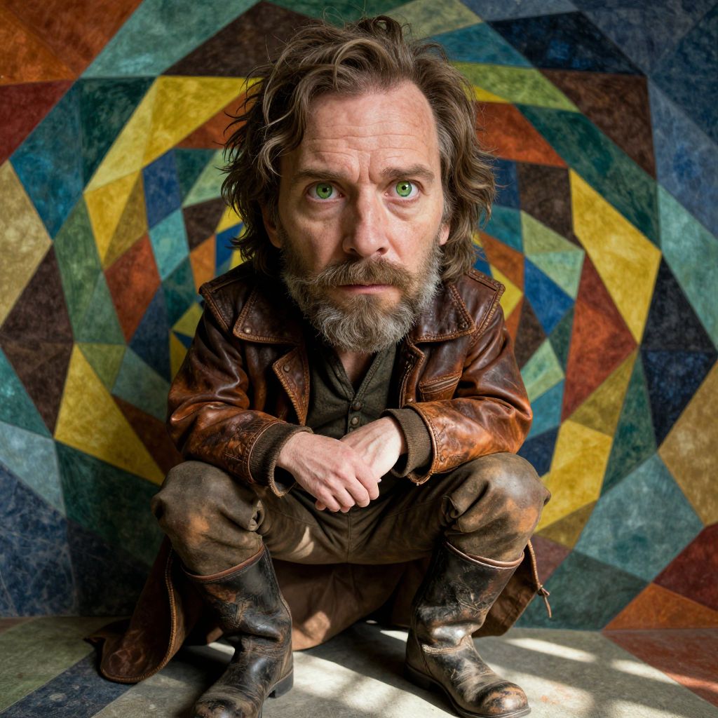 Photograph of a rugged, bearded man with green eyes, wearing a brown leather jacket, squatting against a colorful, geometric background.