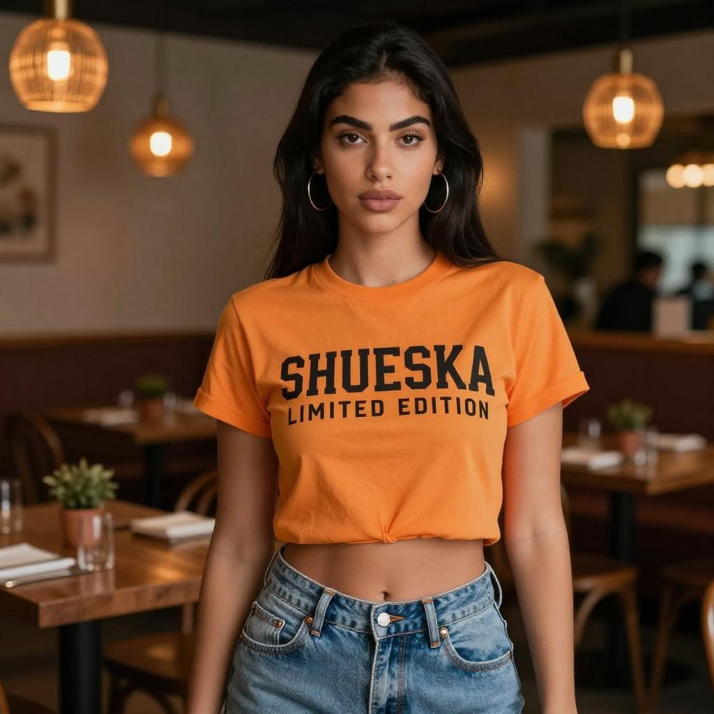 Photograph of a young woman with long, dark brown hair and brown eyes standing in a dimly lit restaurant. She wears a bright orange, cropped t-shirt with "SHUESKA LIMITED EDITION" in bold black letters and high-waisted blue denim jeans. Her expression is neutral, and she has large hoop earrings. The background features warm, hanging light fixtures, wooden tables with potted plants, and blurred restaurant patrons. The overall ambiance is cozy and modern.