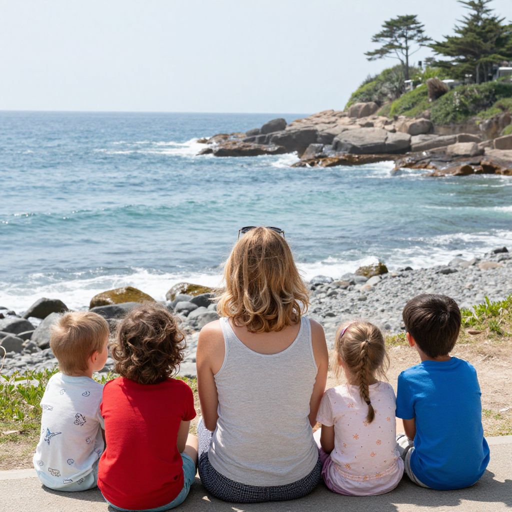 Photograph of a woman with curly brown hair, wearing a white tank top and denim shorts, hugging a child on a sunny beach, with colorful
