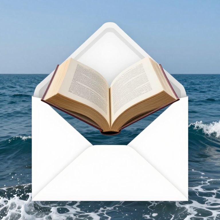 Photograph of an open book with yellowed pages, floating above dark blue ocean waves. The book's pages, filled with text, are centered in the image, with the upper edge pointing upwards towards a clear, light blue sky. The white triangular shape at the bottom right corner partially obscures the ocean, creating a surreal effect. The book's edges are slightly worn, adding a sense of age and wisdom. The ocean's surface is textured with small waves and foam. The overall composition blends elements of reality and digital manipulation, giving a dreamlike, ethereal quality to the scene.