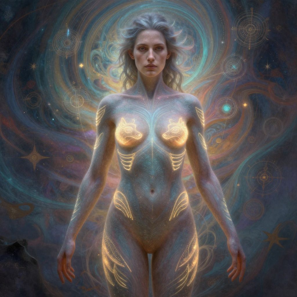 Digital artwork of a glowing, ethereal woman with flower tattoos, illuminated by bright sunlight, standing against a hazy, pastel sky.