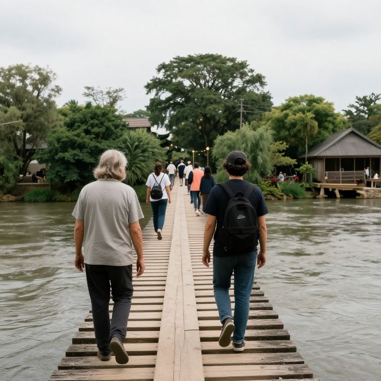 A bridge made of memories stretches over a river of forgotten names, travelers losing themselves in echoes of their past with each cautious step.