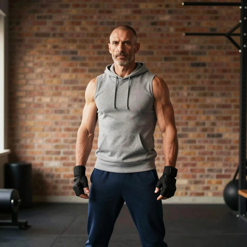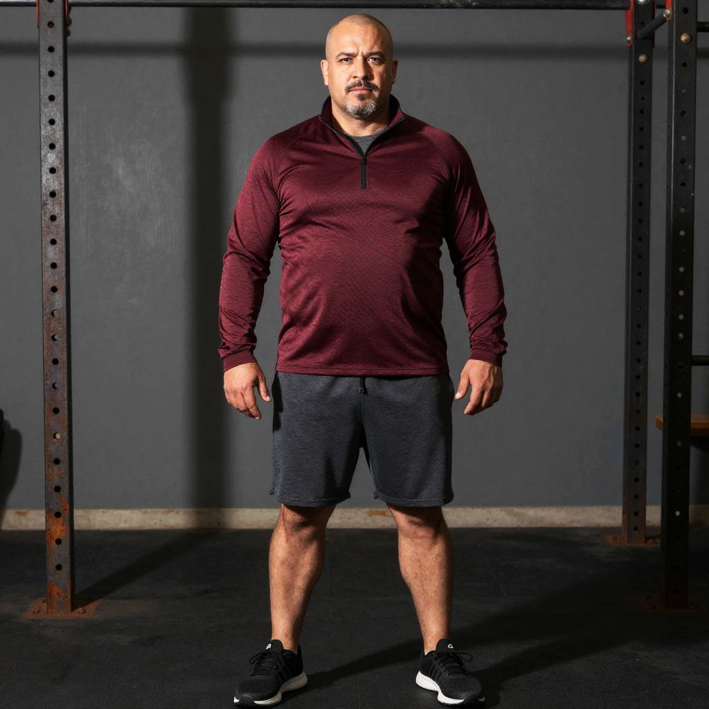 Muscular man with shaved head and clean-shaven face, white athletic t-shirt, charcoal gray running shorts, black athletic socks, neon green running shoes, suburban park path lined with blossoming trees and soft morning light, minimal jewelry, confident full-body stance, clean composition, soft directional lighting, cinematic editorial mood, shallow depth of field, subtle film grain, crisp textures, detailed fabric ribbing, lifelike skin, balanced exposure, gentle rim light, long soft shadows, rule-of-thirds framing, slight vignette, realistic proportions, professional retouch finish