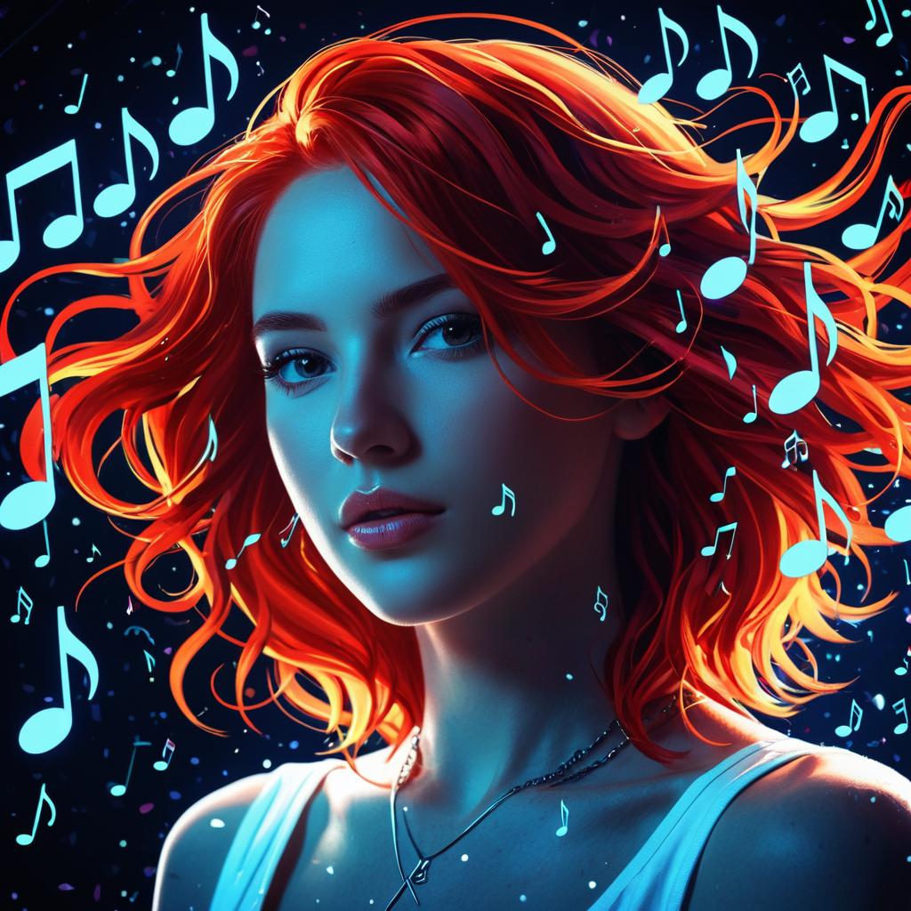Anime-style digital illustration of a confident Caucasian woman with red hair surrounded by floating music notes, vibrant and expressive, with high contrast and soulful expression. Dynamic composition with flowing hair integrated with musical elements, glowing neon colors, and professional lighting, evoking musical inspiration. Ultra-detailed, 4K resolution, with a music-themed, expressive, and soulful vibe.