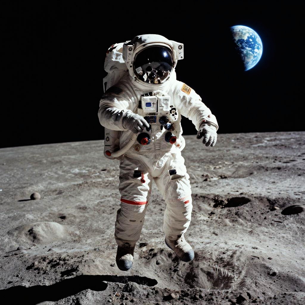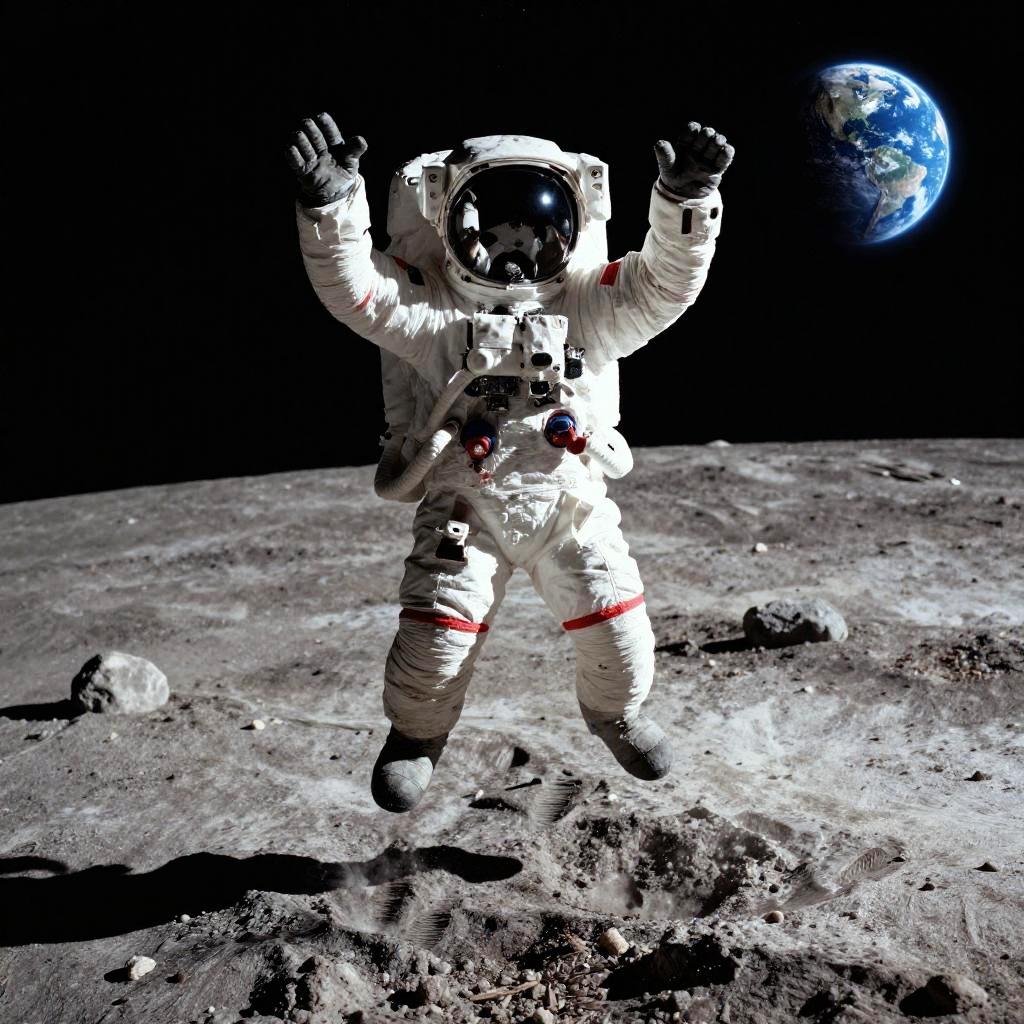 Astronaut jumping on the moon under a starry night sky, detailed spacesuit reflecting Earth in the background, lunar surface textured with craters, dramatic shadows and a sense of weightlessness, photorealistic style.