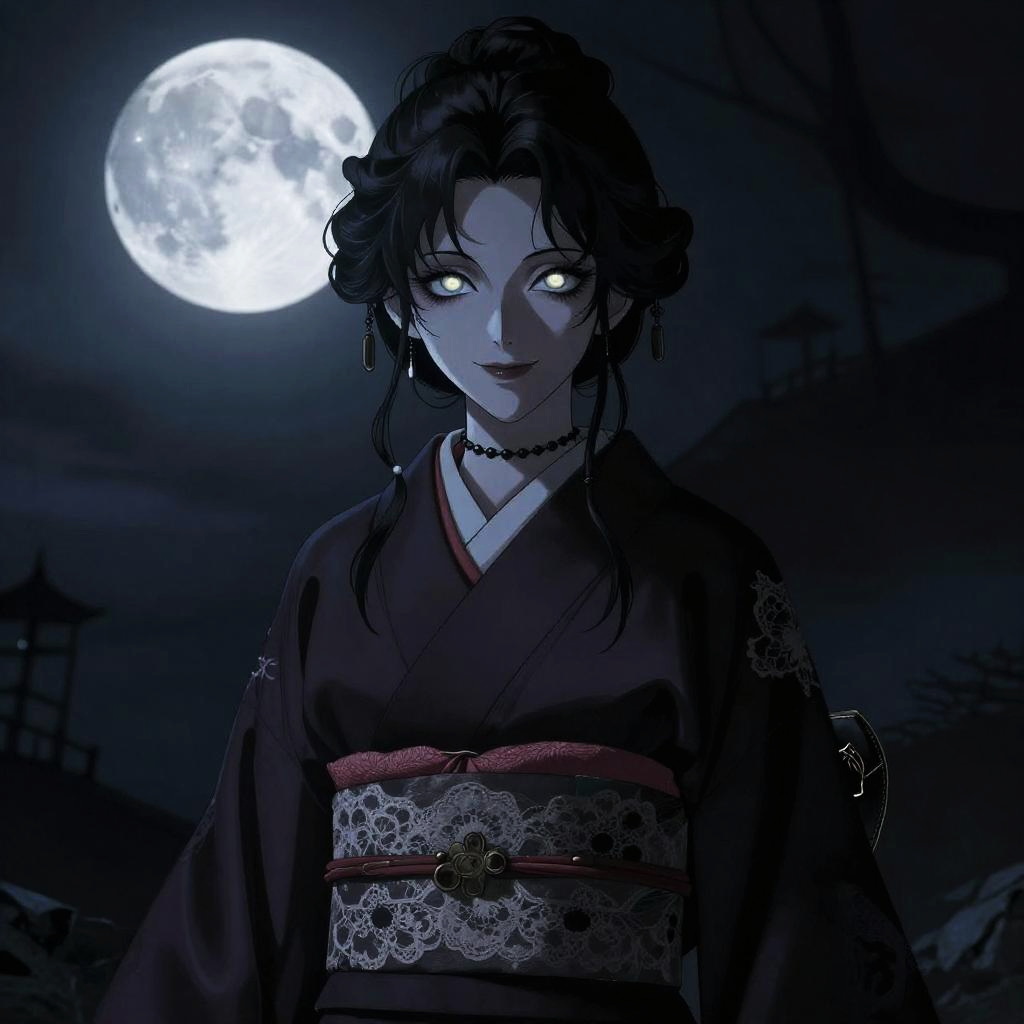 By Harumi Hironaka, Benedick Bana Yoshitaka Amano, moebius, castlevania, dark, horror, medieval, shadow, night, moonlight vampire girl, midnight silk kimono with lace obi and choker, detailed smile, detailed glowing eyes, detailed face, elaborate topknot with loose side tendrils, jewelry, from below, not smiling